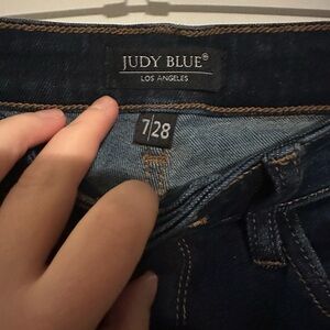 Judy Blue dark wash flare jean. Size 7/28. New condition without flaws. Cute for winter or fall. Waist 13”. Waist to hem 38”.