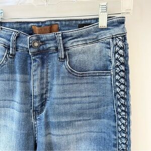 Features a braided trim down the outside of both legs, Classic 5-pocket styling, button & zip fly, cropped length.