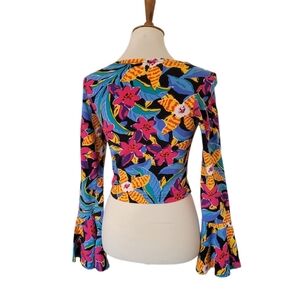 Excellent pre owned condition. Judy Knapp 80's Mod Floral Crop Flutter Sleeve Top. Scoop neck. Long sleeves. Cropped. Cotton lycra blend.
