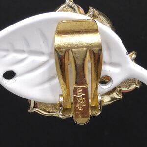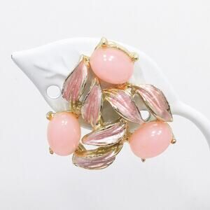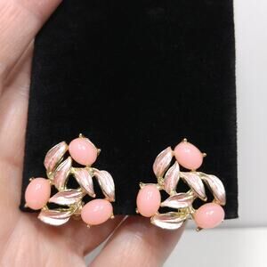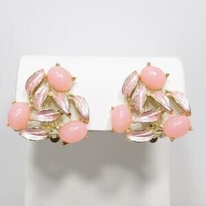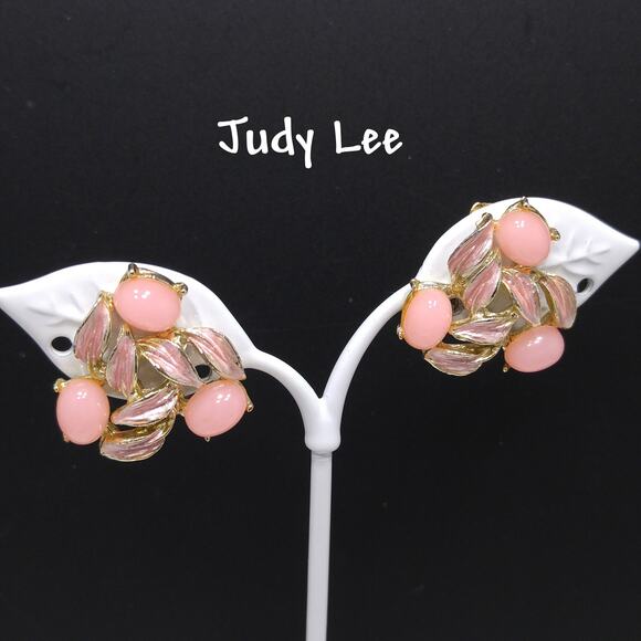*Description: This is a beautiful pair of vintage Judy Lee pink Lucite & enamel clip earrings from the 1950s. This pair of earrings is highlighted in Julia C. Carroll's book Costume Jewelry 101 where she explains, "these earrings feature creamy pink oval cabochons and shimmering pink enamel over gold leaves." Each earring has three pink Lucite cabochons with pink enamel painted leaves. They would make a great addition to your vintage jewelry collection and also make a great gift.