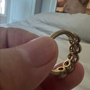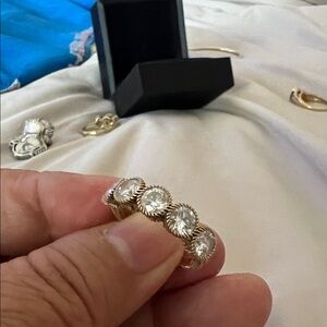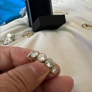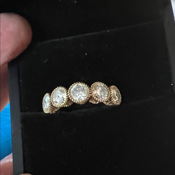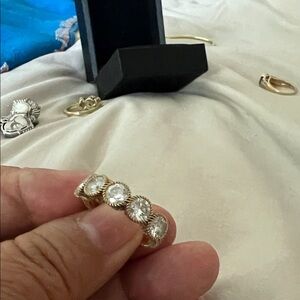 Shiny goldtone band ring with five clear crystal stones set in decorative halo bezels. Stylish gold finish and sparkling crystals create a refined look. Perfect for stacking or wearing solo for everyday elegance.