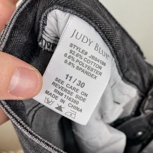 The product is a pair of women's Judy Blue skinny jeans in size 11 with a 30-inch waist and a 26-inch inseam. These black distressed jeans feature a button fly and are made of 92.6% cotton, 6.6% polyester, and 0.8% elastane. The high rise jeans have a 5-pocket design and come in a regular fit. Perfect for all seasons, these stylish and comfortable jeans are a versatile addition to any woman's wardrobe.
