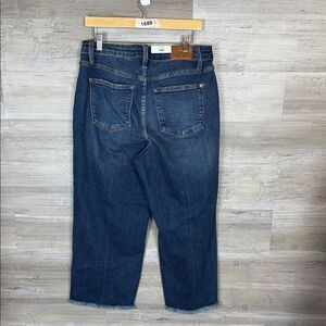 Chic dark wash jeans with button fly. Cropped ankle length. Distressed hem for a trendy look.