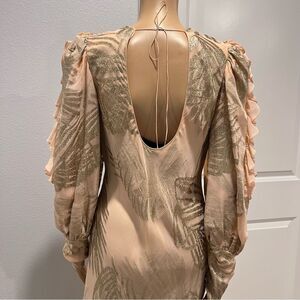 * Dramatic puffed sleeves with a ruffled center slit and peaked shoulders