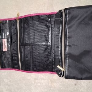 Stylish leopard print cosmetic bag with a pink trim and handy hanging hook. Perfect for organizing your beauty essentials.