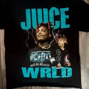 You are viewing a graphic Juice WRLD concert tee in black featuring vibrant full-color print. Great streetwear, hip hop merch, band tee aesthetic. No holes, stains, or excessive fading beyond normal wear. Soft cotton feel, fits true to a standard tee. Ideal for fans of rap merch, vintage style graphic tees, emo rap, street style outfits.
