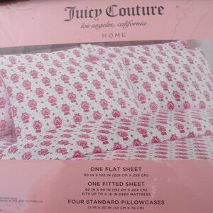 This is a new (sealed package) Juicy Couture QUEEN size 6-piece white and pink sheet set with Gingerbread houses in snowglobes and JC logo print on the print. The set includes 1 queen flat sheet, 1 queen fitted sheet, and 4 standard pillowcases.
