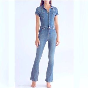 Juicy Couture 90s Y2K Baby Flare Stretch Denim Short Sleeve Button Front Fitted Jumpsuit. Excellent preowned condition. (has lots of stretch) Pit to pit approx 14.5” Waist approx 13” Inseam approx 30” First image is a stock photo for style reference only.