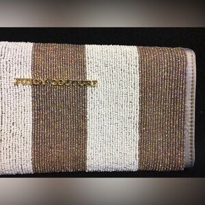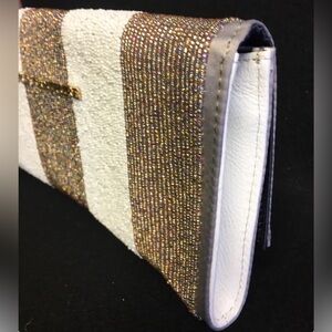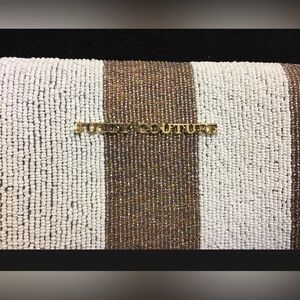 The entire flap clutch is created of intricate iridescent beadwork in gold and white stripes. The beading has wonderful texture in addition to gorgeous shimmer. Juicy Couture print logo on back. Magnetic snap closure.