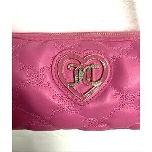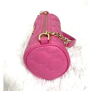 Juicy Couture Bag Pink Rhinestone Logo Barrel Shoulder Bag Handbag Purse, see pictures for more details. The Juicy Couture Pink Rhinestone Logo Barrel Shoulder Bag is a stylish and versatile handbag perfect for various occasions. This small-sized shoulder bag features a cylinder shape with a zip closure and a pink handle/strap, making it easy to carry. The exterior is made of faux leather and leather with a quilted finish, showcasing the brand's designer theme. The bag is accented with rhinestones, zipper detailing, and stitching, adding a touch of luxury. With inner pockets and a coin purse charm, this handbag combines fashion and functionality for a chic look. Measurements 9x6x4.