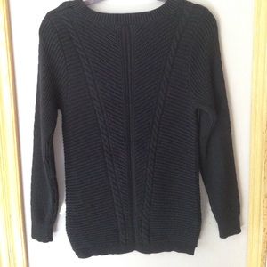 Super soft black Juicy Couture sweater. Cables vee on front and back for a slimming look. Length falls below the hips. A great staple for your fall and winter closet.