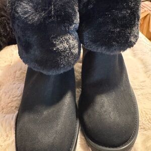 Elegant black boots with plush fur trim. Ideal for winter wear.