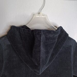 * Jacket details: soft plush velour fabric, long sleeves, full front zipper with J pull, drawstring hood with metal tips, front hand pockets, ribbed cuffs, and hem.