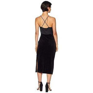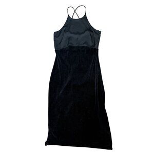 Elegant black midi slip dress by Juicy Couture Black Label. Features velvet skirt, satin top, criss-cross straps, and side slit. Perfect for parties, date nights, or holiday events..