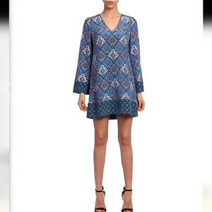 Long sleeve printed V-neck dress with bell sleeves with a different print color block detail. Silk. New with tags
