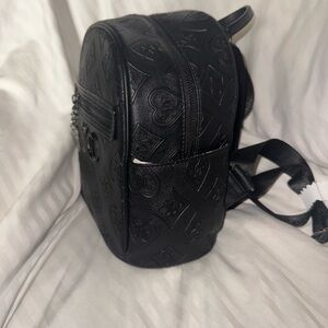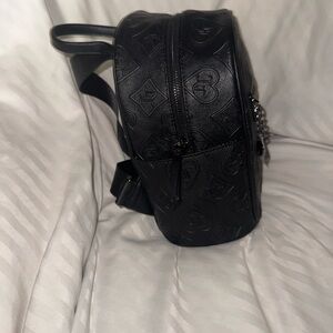 This Juicy Couture backpack features a sleek, all-black design with a textured finish that adds a subtle dimensional quality. Its compact size and classic silhouette make it a versatile accessory for any occasion.