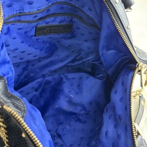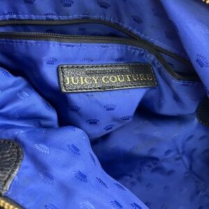 This Juicy Couture shoulder bag features a sleek black design with elegant tassel detailing and silver-tone hardware. Its structured yet slightly slouchy silhouette offers a versatile style suitable for both professional and casual settings. The bag's smooth leather texture and clean lines make it a timeless accessory for everyday use.