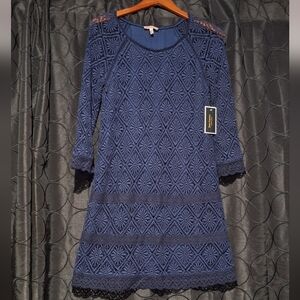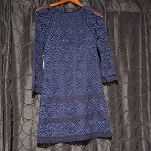 This Juicy Couture dress showcases a rich blue hue and a classic crew neckline, enhanced by a detailed geometric knit pattern. The textured design adds visual interest, making it a standout piece in any wardrobe. Perfect for layering or wearing on its own, this sweater combines style and comfort effortlessly.