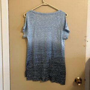 Cool Blue Ombre Metallic Top. From Sky Blue to Ocean Blue to Dark Navy Blue in Metallic. Cold-Shoulder. Slits on the Side. 63% Poly, 24% Nylon, 10% Metallic, 3% Spandex. Measures 17-1/4" to 20" p2p and 24-1/4" long. Very Stretchy. Perfect with a White Pair of Jeans. Juicy Couture.