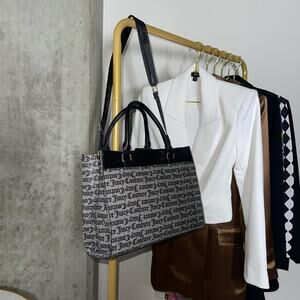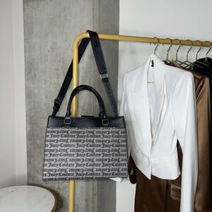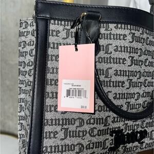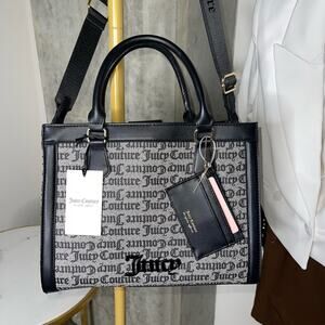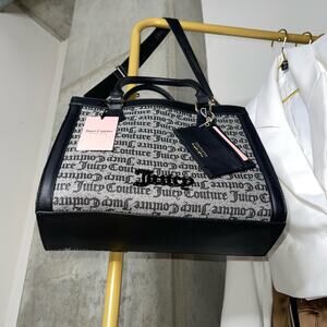 So cute! 🖤 Brand new with tags! Features a faux leather exterior, a spacious interior with one zipper pocket + two slip pockets, one middle zip compartment, back exterior slip pocket with snap button closure, a top snap button closure, an adjustable strap with Juicy Couture logo, two top handles and a removable card wallet. Color: Black Beige.