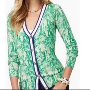 Juicy Couture Women's Wool Python Snake Print Button Down Cardigan Sweater in wonderful condition. Slight darkening on interior trim. Full button-down with Juicy Couture engraved buttons. JC gold-tone logo on front pocket. Long sleeves with cream/green trim around collar and front. 100% wool.