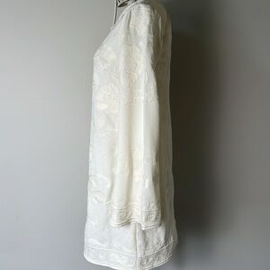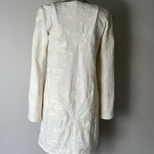 Juicy Couture Cream Angel Embroidered Crepe Dress- has a floral embroidery. Fully lined. Straight dress with slightly flared long sleeves.