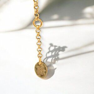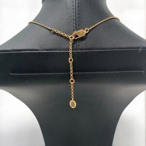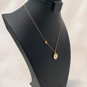 A dainty and elegant Juicy Couture gold tone necklace featuring an adjustable chain and a charming cream & gold enamel daisy pendant. Perfect as a stand alone necklace or for layering. Excellent preowned condition.
