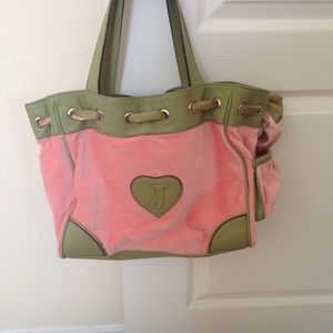 Pink Daydream Tote with green leather trim. It has the green heart with pink terry balls and Juicy pin attached on the front, also has a inside heart mirror attached (little wear on the mirror inside strap). Bag is in excellent condition (M/L size)