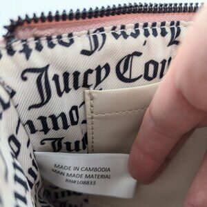 Dusty blush faux leather with quilted diamond pattern on front & back. Front has a dusty blush faux leather heart with gold tone metal Juicy logo in center of heart. Dusty blush faux leather wrist strap, strap drop 6.5”. Top zip closure. Inside wristlet, there is one slip pocket plus card slots with black & white lining with graphic print Juicy Couture printed throughout. The price part of the tag has been removed.