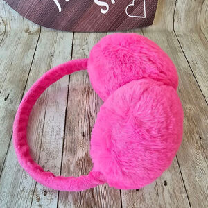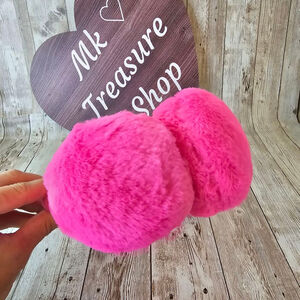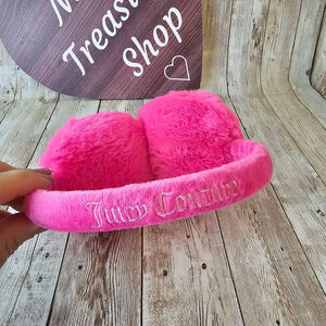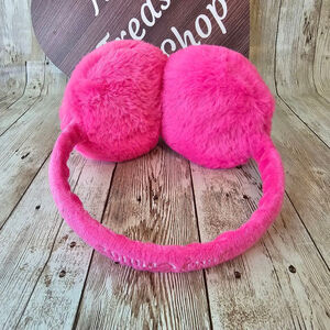These are new, pink earmuffs with a faux fur exterior and a soft, plush lining. The headband is made of a soft material and has the words "Juicy Couture" embroidered on it in white.