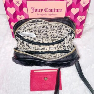 Juicy Couture Faux Fur Black Heart Crossbody Bag & Pink Card Case Wallet Set