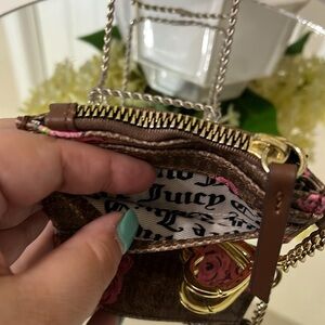 🌺 Exterior: Gold Hardware, heart chain that says Juicy Couture on it, on the front in gold it says Juicy, zipper. On back there are 2 card holders, on the front there are 2 card holders (see photos).