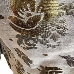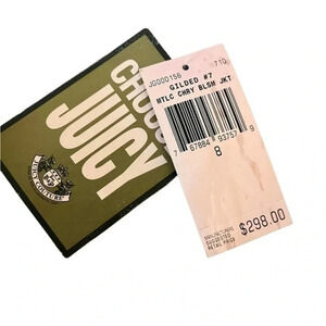 This very unique jacket, features a tie front end/pockets. The silk cotton blend is gilded in gold back in front. It comes from Juicy Couture’s high end line and the tag says size 8, $298. It is approximately 18 inches long and the shoulder width is 15 and the sleeve length is 15 inches. Catherines Is a closet for anyone who is looking for something different , unique and high-quality.