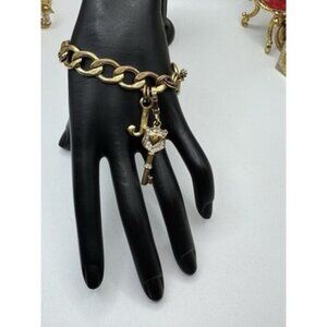 This vintage piece is signed by Juicy Couture and is made with a gold color, rhinestone and Cuban link chain type. The bracelet has a unique toggle clasp closure and dangle charm style, showcasing a key-shaped .