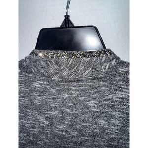 Elevate your everyday style with this chic cardigan. This open-front cardigan features a soft, heathered gray knit that drapes beautifully, creating a flattering silhouette. The neckline is adorned with delicate embellishments, adding a touch of sparkle and sophistication. This cardigan is perfect for layering over a simple tee or dress, adding warmth and style to any outfit. Wear it to a casual brunch, a cozy evening at home, or a stylish office setting.