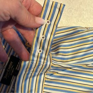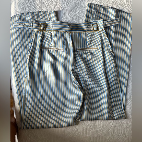 This is a thin strip pattern with a zipper in the front along with pockets on the sides. The waist band has adjustable straps to fit perfectly. Width of the pants on the bottom.Colorful silk sets the scene for the evening,combined with feather- light bases for comfortable movement and creating particularly interesting interplays of color,perfect for eye-catching solutions on special summer occasions. Length of the trousers 45”. Waist 15”. Hips 19”. Measurements are flat lay and approx. BRAND New without tag. No flaws/defects.Feel free to ask any questions. Offers are welcome.