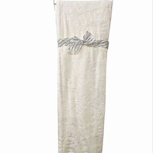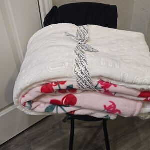 Plush blanket with vibrant cherry design. Juicy Couture logo detail.