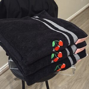 Elegant black towels featuring vibrant cherry embroidery. Juicy Couture adds a chic flair.