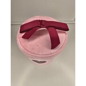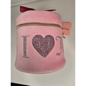 New/Never used Juicy Couture I Love Juicy Round Travel Cosmetics Bag. Includes one travel bottle. Measures approximately 6" x 6"