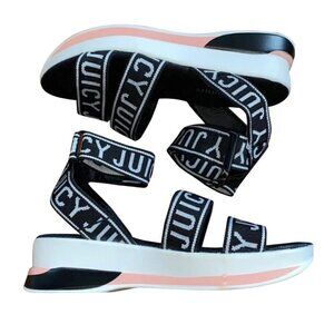 Juicy Couture Impulse Wedge Ankle Strap Logo Sandals Size 7. 2" Wedge, 1" Platform, Cushioned Sole, Y2K, Black White Hint Of Pink, Super Cute Style, Comfort. Like New Condition, Pre-Owned