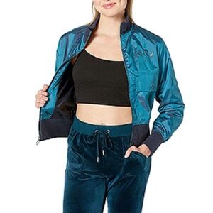 A classic, slightly oversized bomber silhouette in iridescent knit with full jersey lining, double snap flap pockets, embroidered JUICY LA chest logo and a front zip closure for the perfect casual-chic look