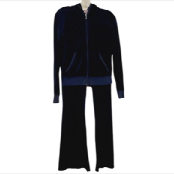 Juicy Couture Jogger set features classic J pullie on jacket. Comes in a navy-blue color. Pants XL and Jacket is L. Kept with care. Pockets are in front of pants and snap pockets are in the back. Waist band stretches with elasticity for comfort. Y2k style. Kept with care and is nice and snuggly for comfort. pants flare at bottom.