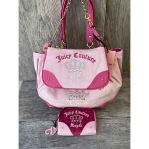 Juicy Couture Juicy Kingdom 3-piece set in light pink velour with rhinestone crown embroidery. Includes tote bag with gold chain handles, matching wristlet purse, and zip-around wallet. All pieces feature the embroidered “Royal” logo and Juicy Couture branding. Brand new with tags. Y2K-inspired design, perfect for collectors and Juicy fans.