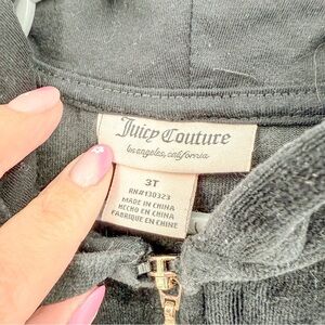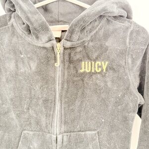 Stylish black hoodie and pants set. Features Juicy logo on chest. Comfortable and trendy.