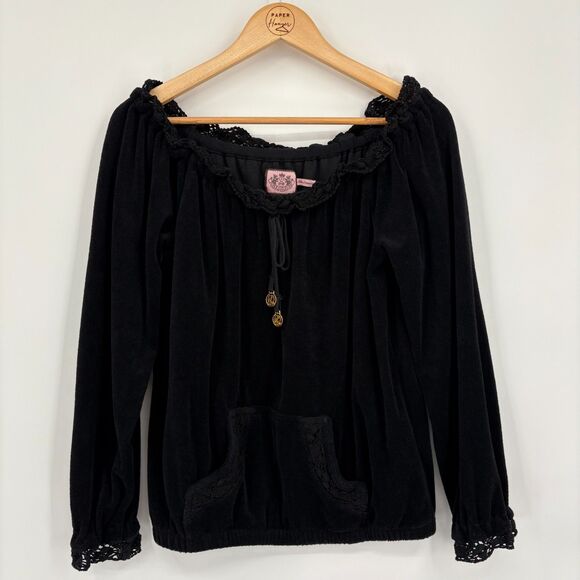 Juicy Couture Lace Trim Long Sleeve Y2K Top, Sz Med, Black Kangaroo Pouch
