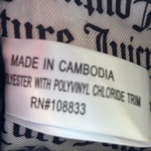 Top zip closure main compartment, with signature Juicy Couture logo print fabric lining, an inner zip pocket, and slip pocket.