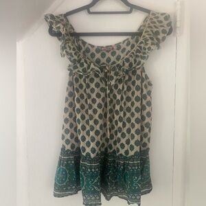 Juicy couture pretty mandala print Boho style top. Featuring a ruffle neckline and sleeve and gold tone buttons.