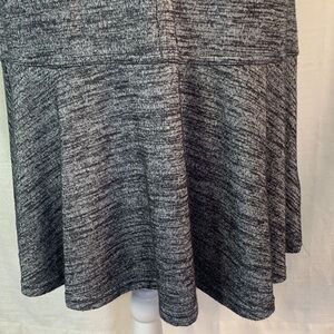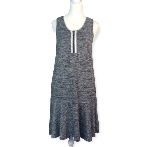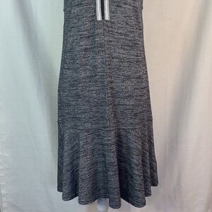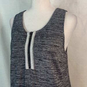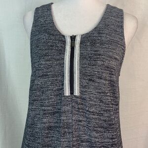 Such a cute little number! Black and light gray marled coloring on this woven dress, feels like a thin sweater, nice and soft as well. The neckline is so fun with the white and silver enveloping the gunmetal zipper front. Drop waist gives this a bit of an unexpected punch to an otherwise straighter fit type dress. I love this with white sneakers!
