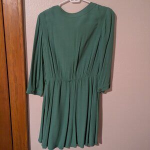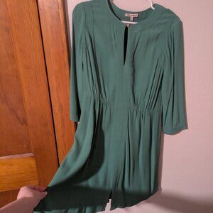 Juicy Couture Mini Dress in a soft blue-green. Material is 100% Viscose that is very flowy and comfortable. Key hole top with gold button. 3/4 length sleeves have gold buttons as well. Side-zip. Unlined.