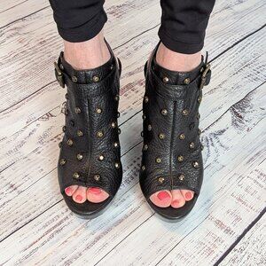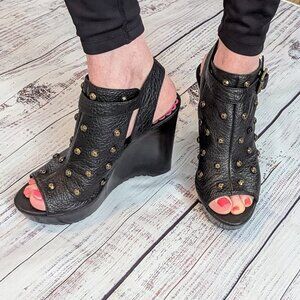 NWOT Juicy Couture Wheeler Open Toe Wedge Platform Sandals Size 7M Black Soft Leather, Studs. Small indention flaw on exterior right heel. New, Never worn. No box, Original drawstring bag included.